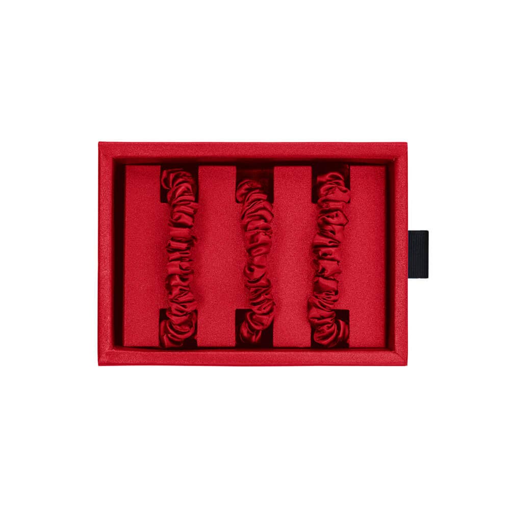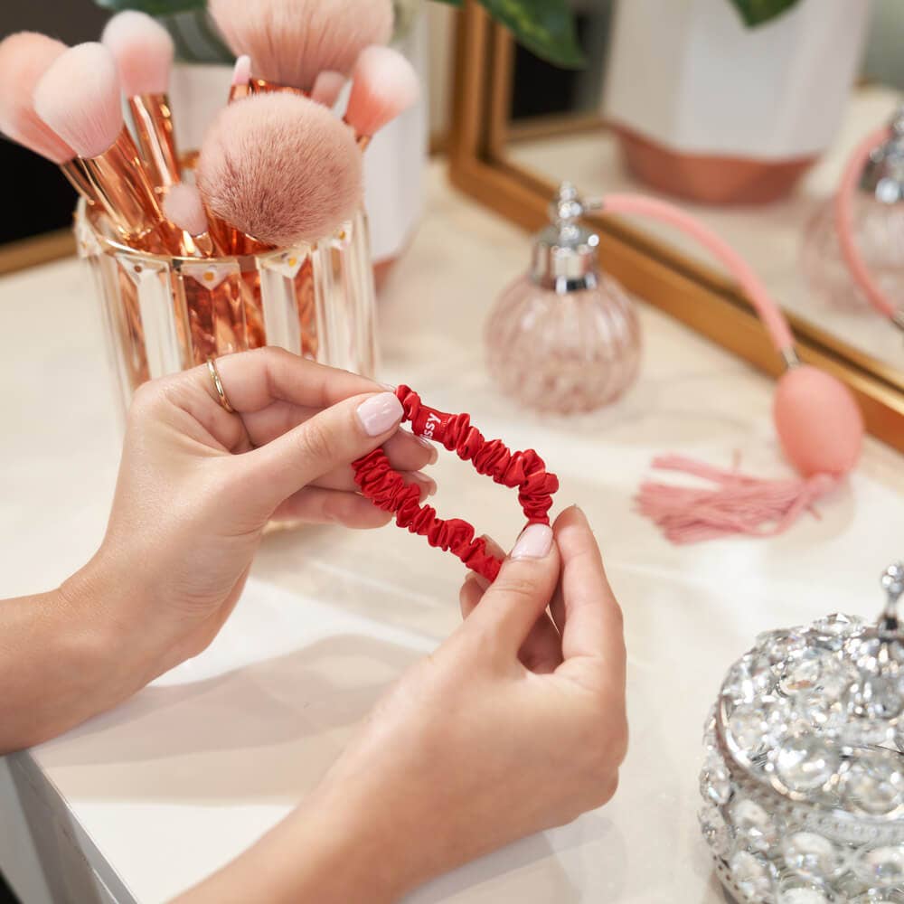 For a delightful pop of color, a red silk skinny scrunchie is just the perfect choice! This eye-catching hair accessory is as bold and beautiful as you are. Blissy Silk Skinny Scrunchies are the safest way to style and care for your hair. Featuring the same 100% mulberry silk we use for our signature pillowcases, Blissy Skinny Scrunchies are made from the finest material in the world. Slimmer than our regular scrunchies, skinnies work for a variety of hairstyles and serve as a stylish replacement for elastic bands. Unlike other scrunchies, Blissy Skinny Scrunchies will not cause creases, dents, snagging, or breakage to your hair. The natural silk fibers in these scrunchies nourish and hydrate your locks, keeping them bouncy and beautiful.