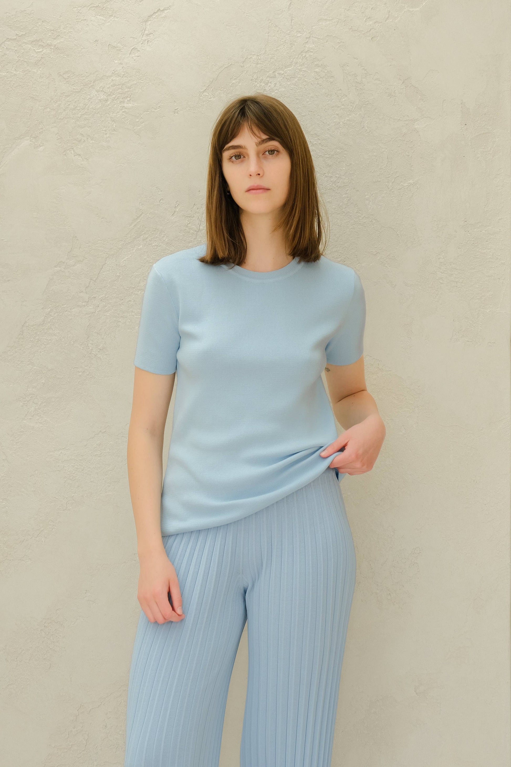 Introducing this classic and comfortable cotton knit t-shirt! Made from premium quality cotton yarn, this t-shirt is designed to provide a soft and breathable feel against your skin, making it perfect for everyday wear. The knit design of the fabric gives the t-shirt a unique texture that adds visual interest and dimension to the garment. The classic crew neckline and short sleeves offer a timeless silhouette that never goes out of style. This versatile t-shirt is perfect for any casual occasion, whether you're running errands, hanging out with friends, or lounging at home. The lightweight and breathable cotton fabric will keep you feeling cool and comfortable all day long.
