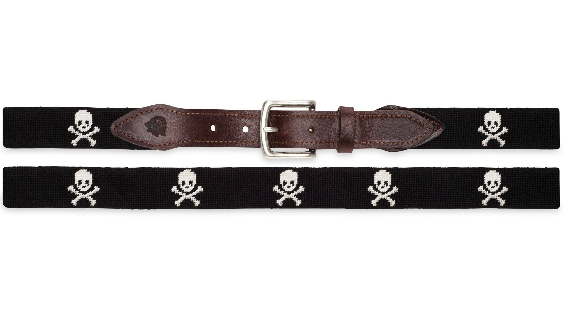 A classic skull + crossbones needlepoint belt in black and white. A favorite for any nautical lover!
