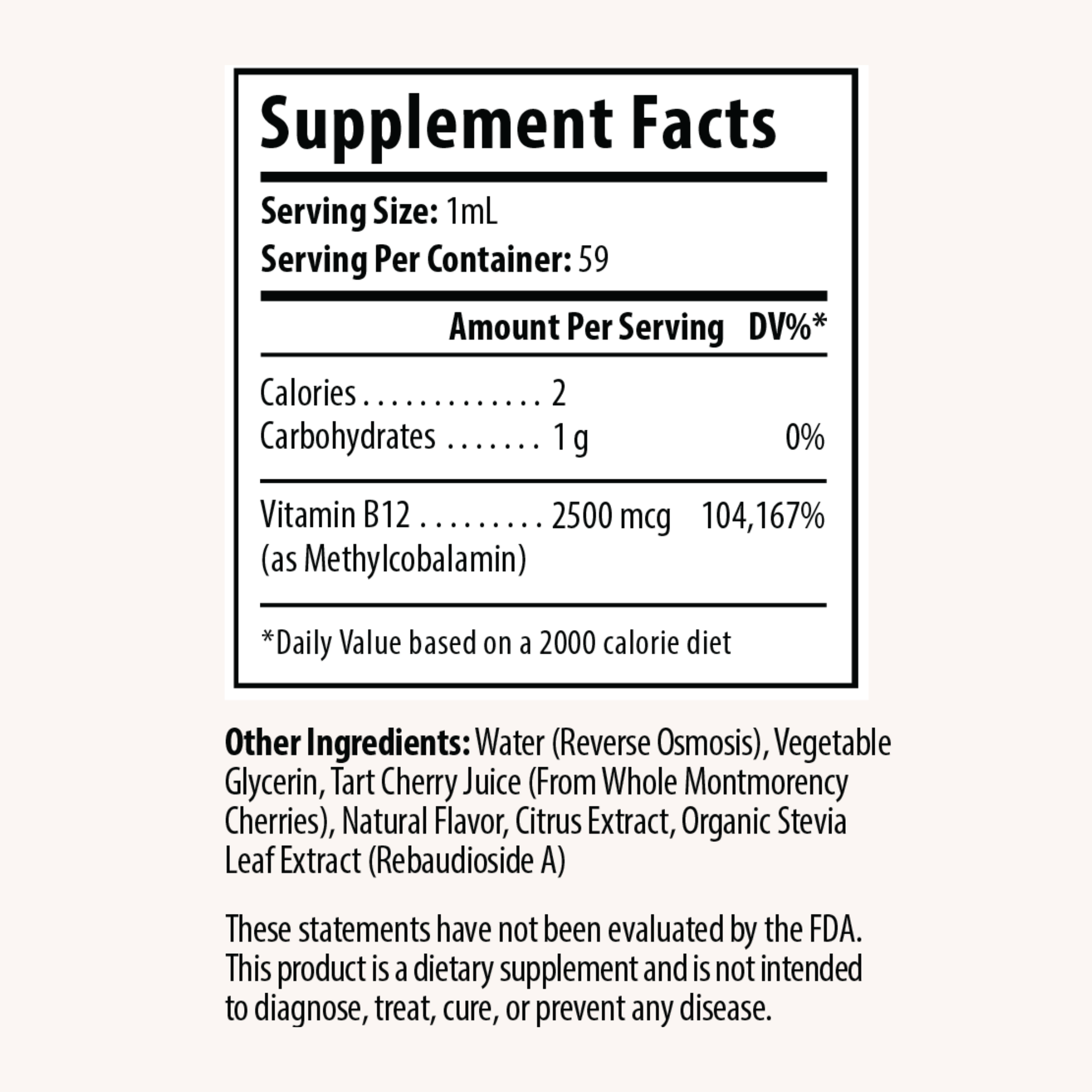 INGREDIENTS: Vitamin B12 (as Methylcobalamin), Water (Reverse Osmosis), Vegetable Glycerin, Tart Cherry Juice (From Whole Montmorency Cherries), Natural Flavor, Citrus Extract, Organic Stevia Leaf Extract (Rebaudioside A) TASTES LIKE: Sweet cherries PERFECT FOR: Adding a few drops under your tongue for a boost of energy, red blood cell production and nervous syst